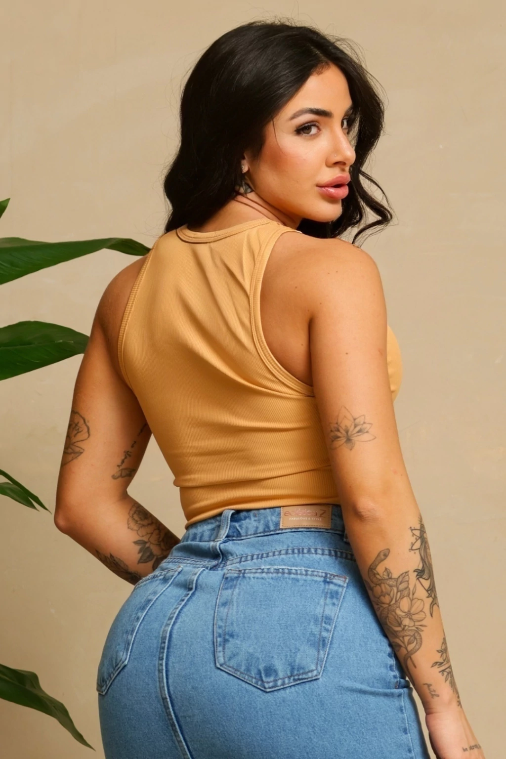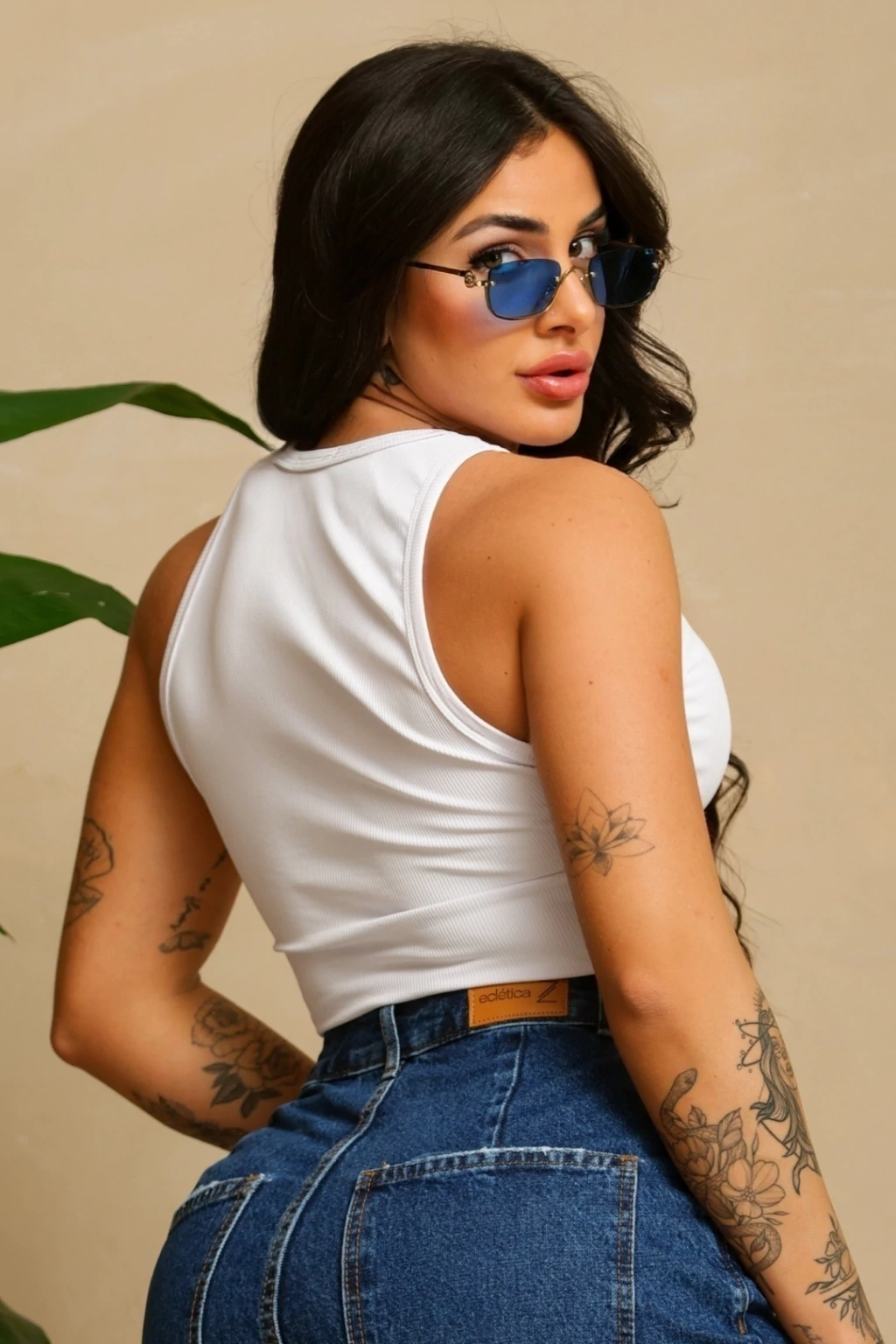 Modelagem: regata cropped, sem mangas, decote em V com detalhe vazado e franzido frontal ajustável que valoriza a silhueta.