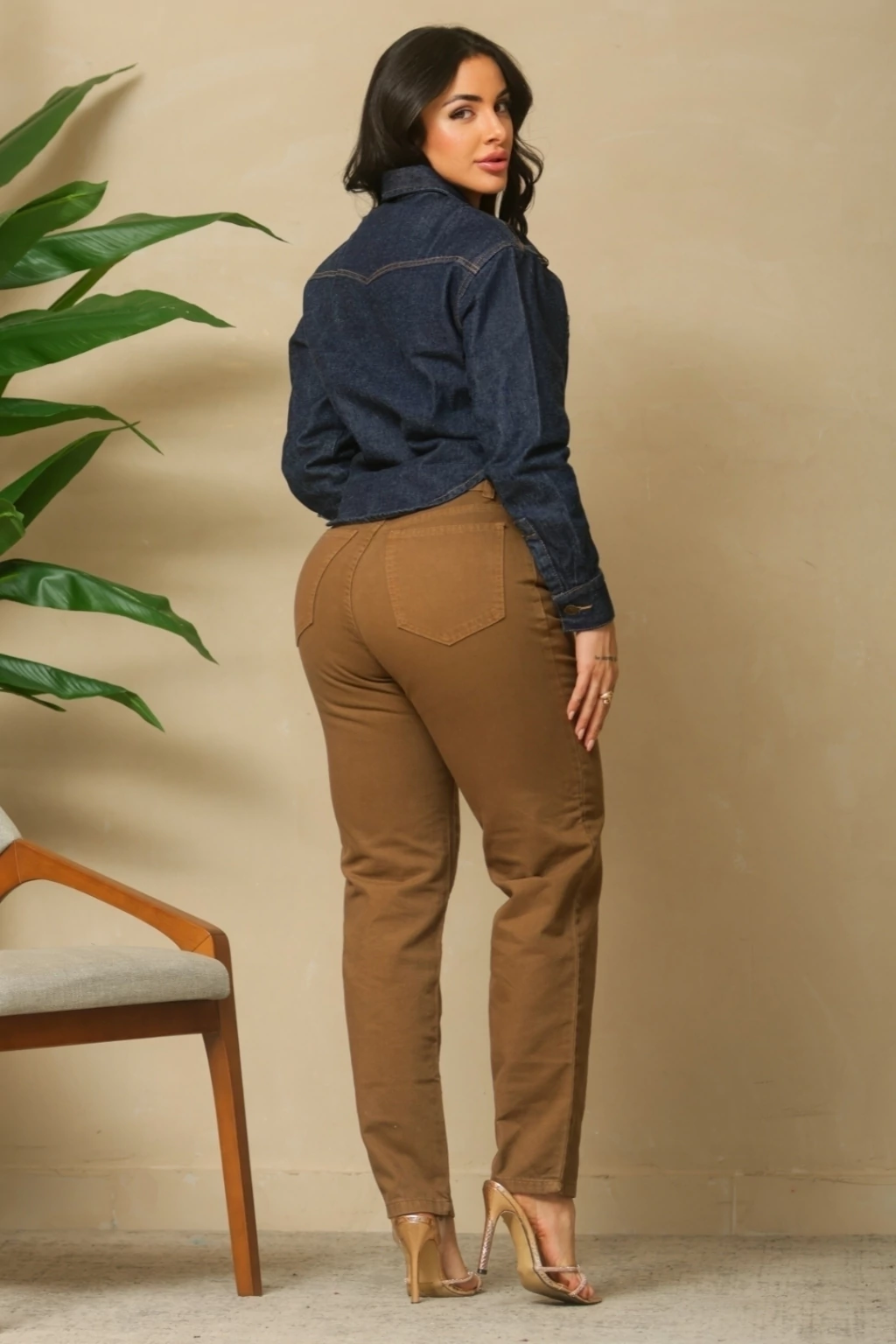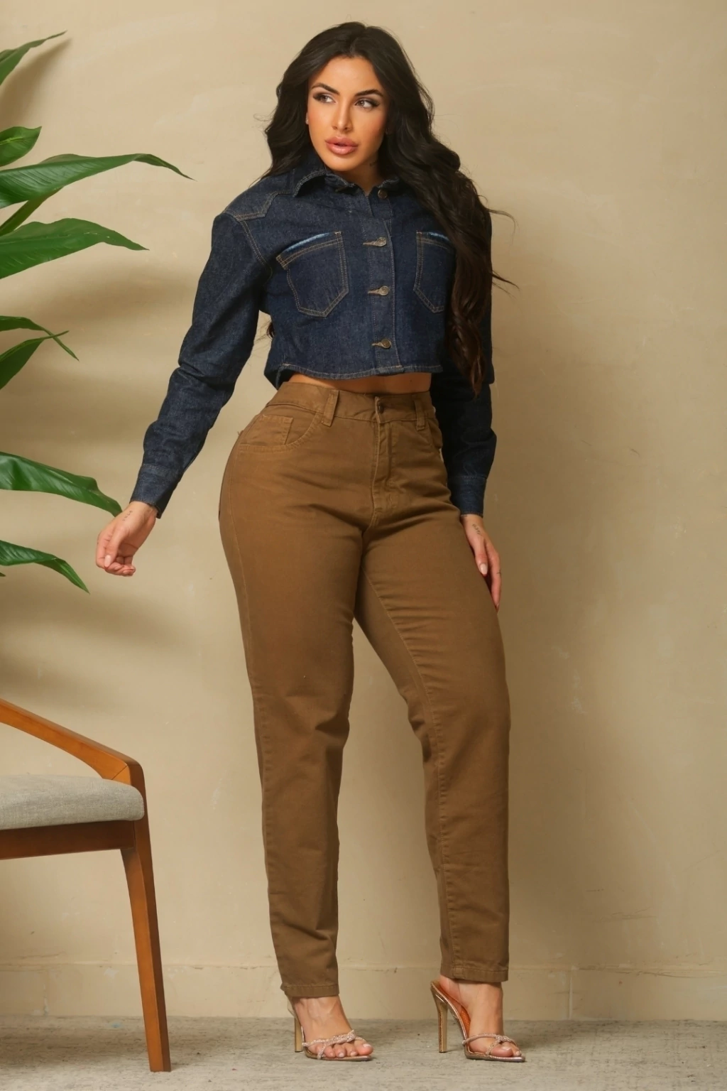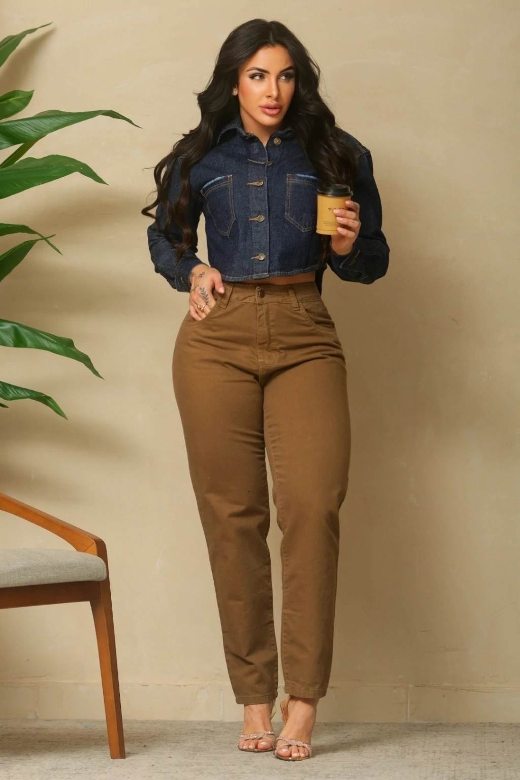 Cor marrom (capuccino), moderna e versátil, perfeita para looks casuais e combinações estilosas no dia a dia.