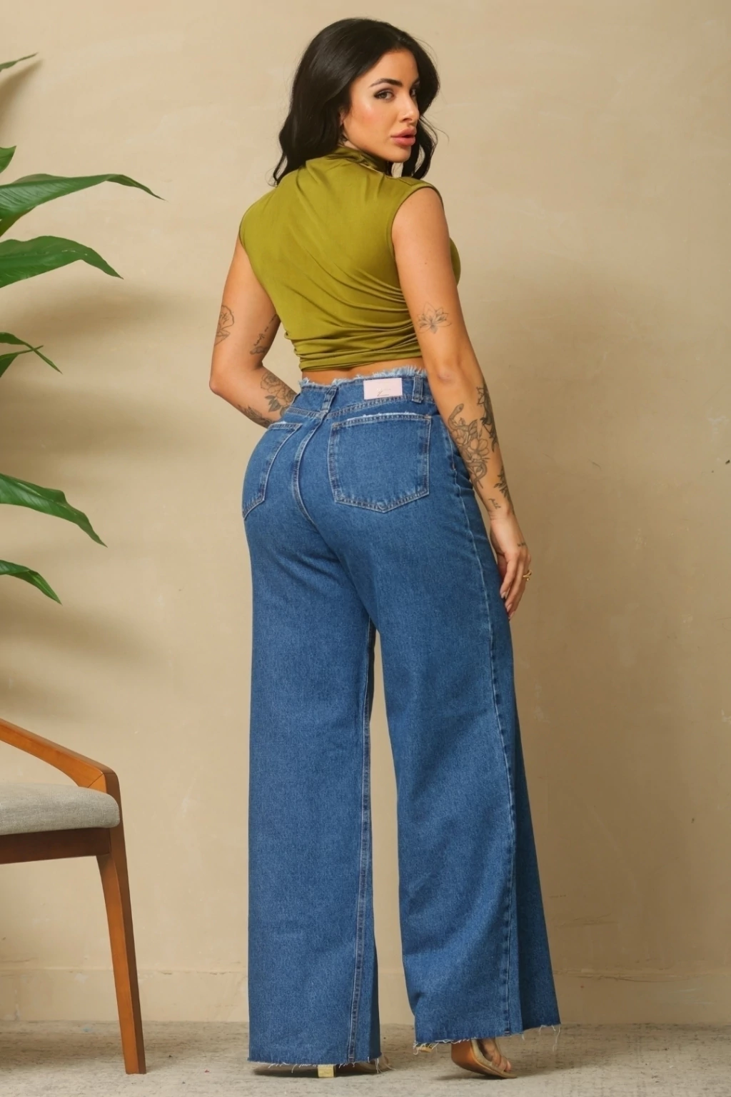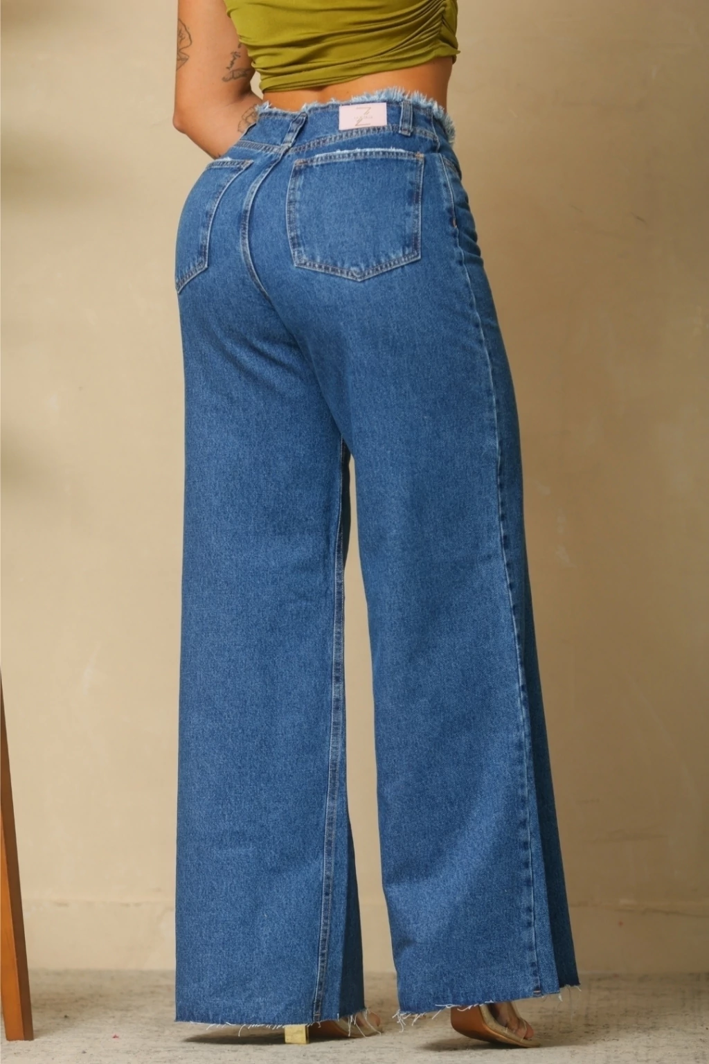 Modelagem: Calça jeans pantalona com estilo moderno e atemporal.