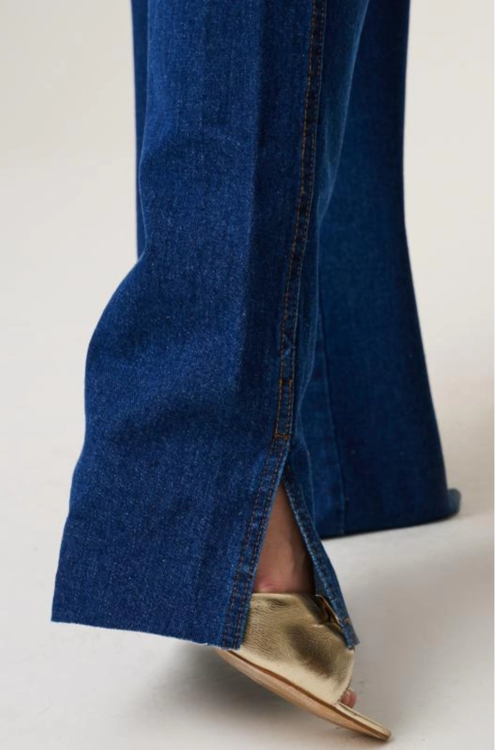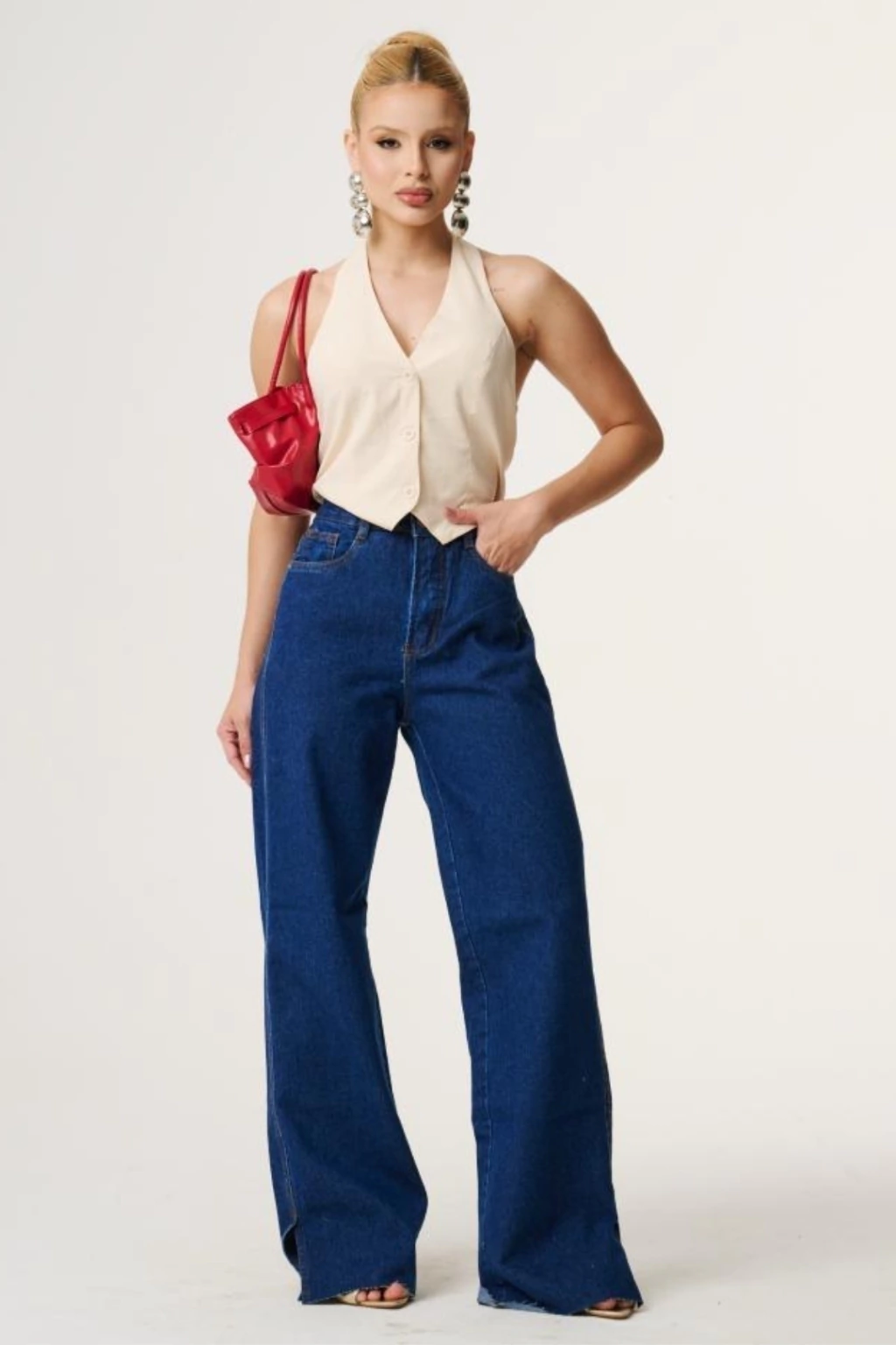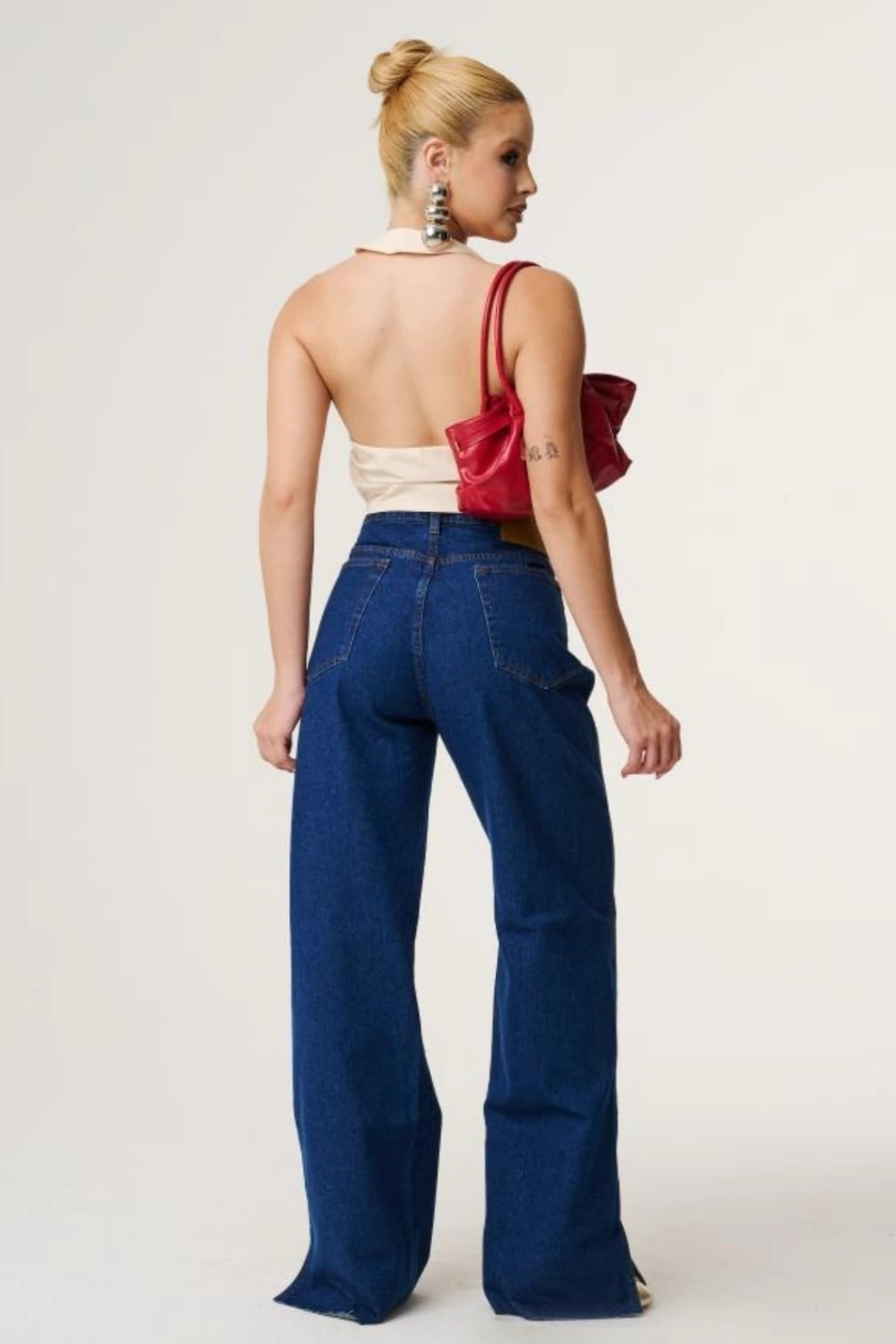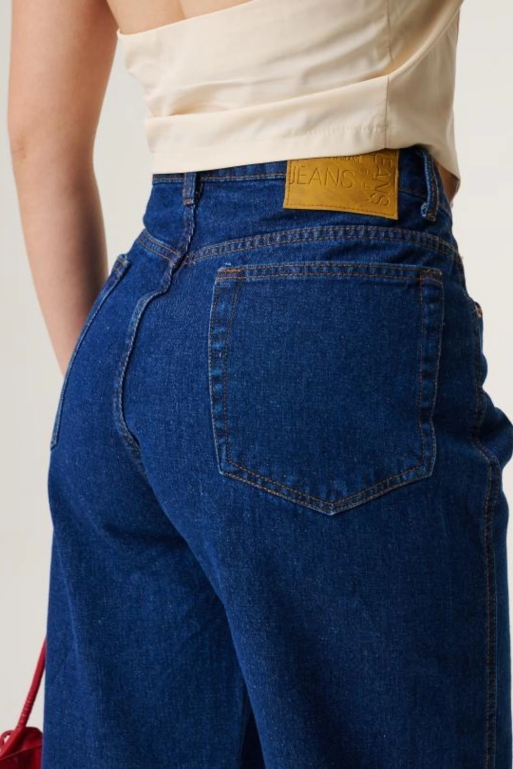 Modelagem: Reta com leve amplitude, conferindo um caimento solto e elegante. Ela tem cintura alta, valorizando a silhueta e alongando as pernas. O cós possui passantes para cinto, e a frente apresenta o fechamento tradicional com zíper e botão metálico. Na parte frontal, há bolsos embutidos inclinados, típicos de calças jeans clássicas, enquanto na parte traseira há dois bolsos aplicados, bem posicionados e com costuras visíveis em tom contrastante (dourado alaranjado), que reforçam o visual tradicional do denim. O tecido tem aspecto encorpado e sem lavagem, mantendo o tom azul intenso e uniforme. A barra é reta e levemente ampla, chegando até o chão, cobrindo parcialmente o calçado, o que adiciona um toque moderno e alongado à produção. Essa calça combina o estilo retrô dos jeans de perna larga com o acabamento polido e estruturado do denim tradicional — uma peça versátil que transita bem entre looks casuais e mais sofisticados.