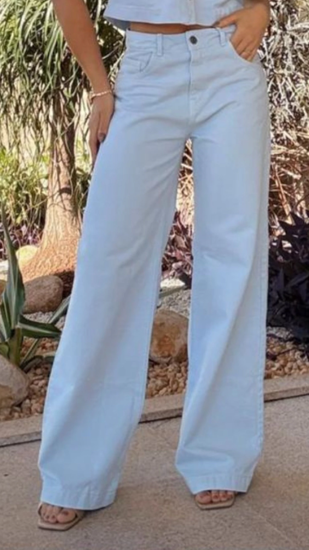 Modelagem: A calça é um modelo jeans feminino de cintura alta, confeccionada em denim branco levemente azulado com aparência uniforme e acabamento liso, sem lavagens marcadas ou rasgos. Possui modelagem wide leg, com caimento solto e reto desde o quadril até a barra, garantindo um visual alongado e elegante. O cós é alto e estruturado, com passantes para cinto, fechamento por zíper e botão metálico prateado central.
