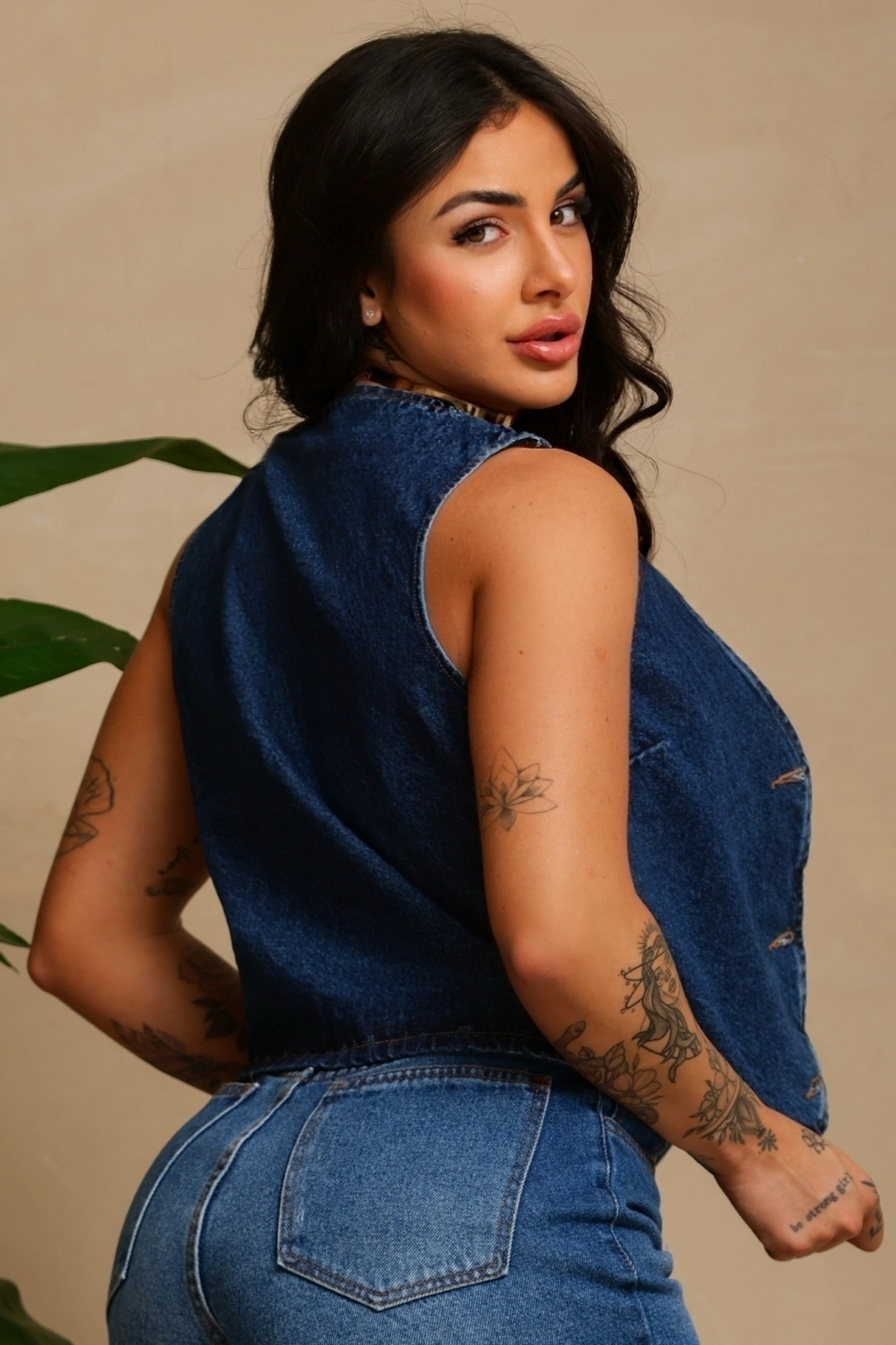 Modelagem: Colete jeans de lavagem escura, com modelagem ajustada ao corpo.