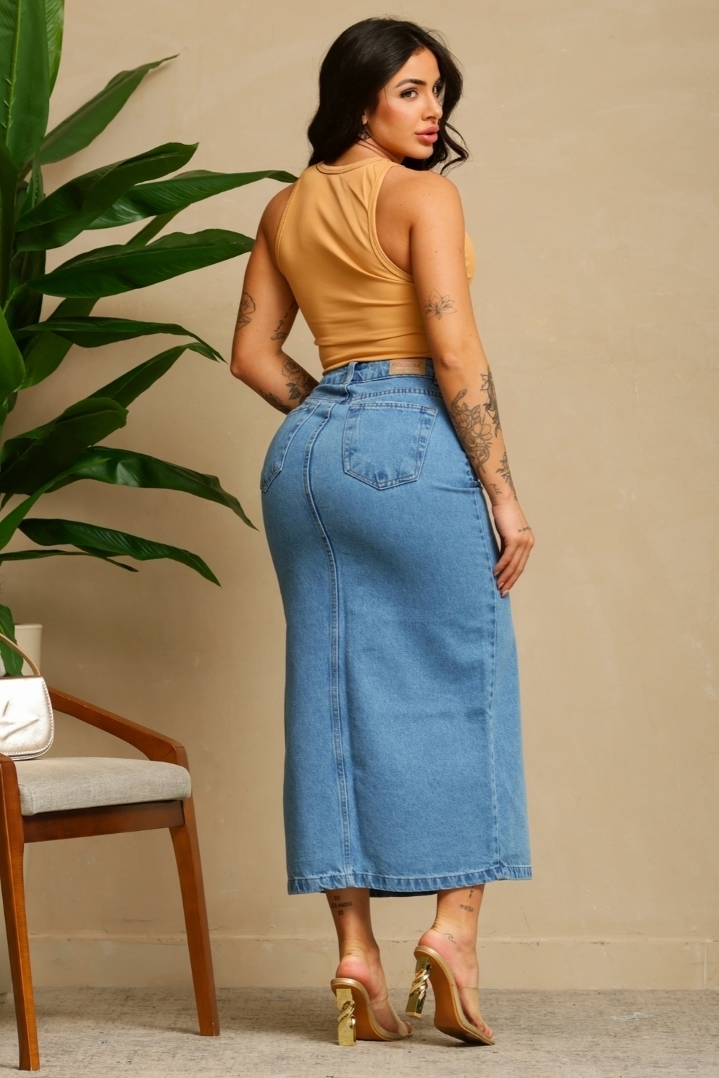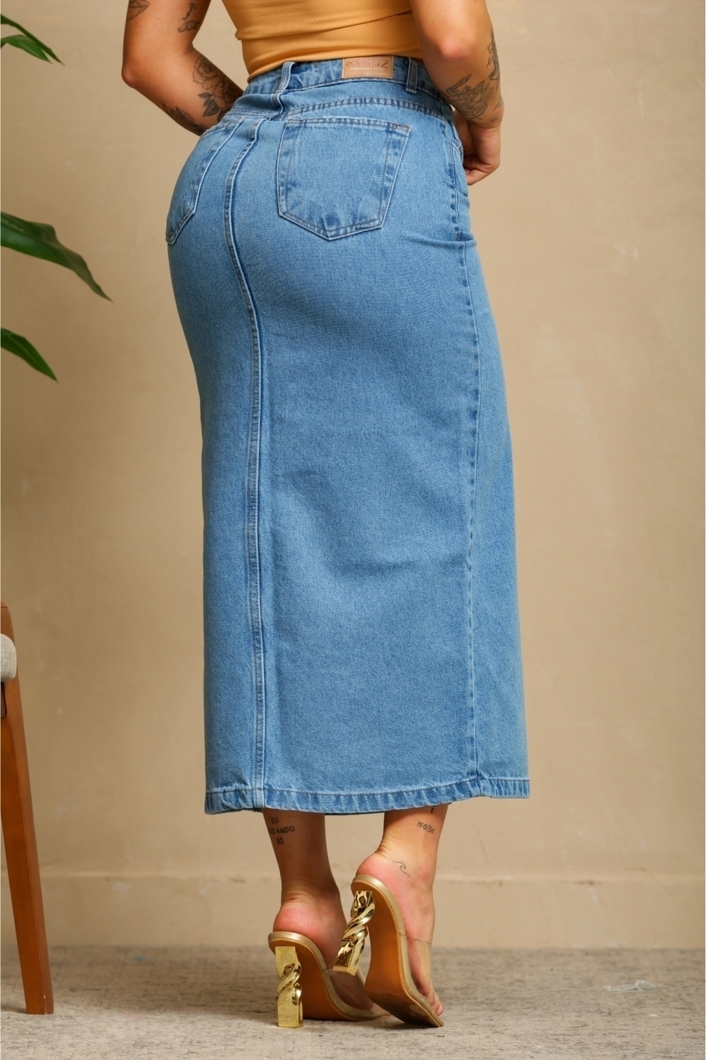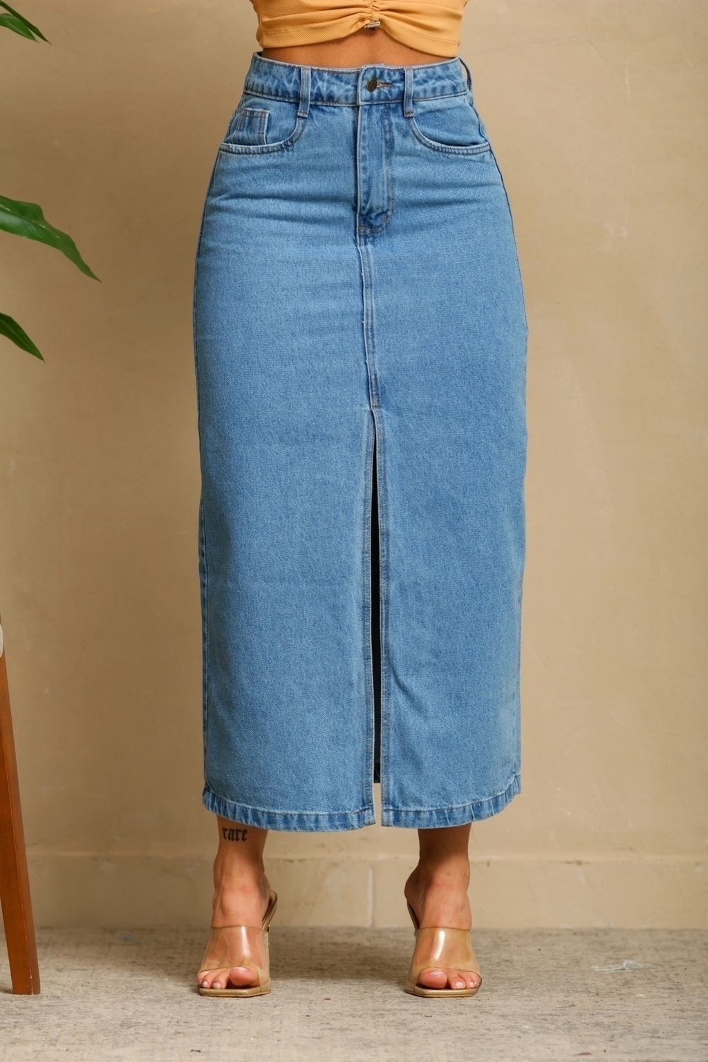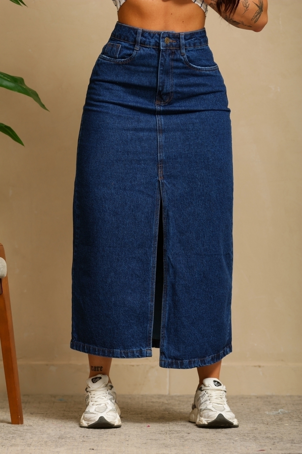 Modelagem: Saia jeans longa em lavagem escura, com modelagem reta e cintura alta.