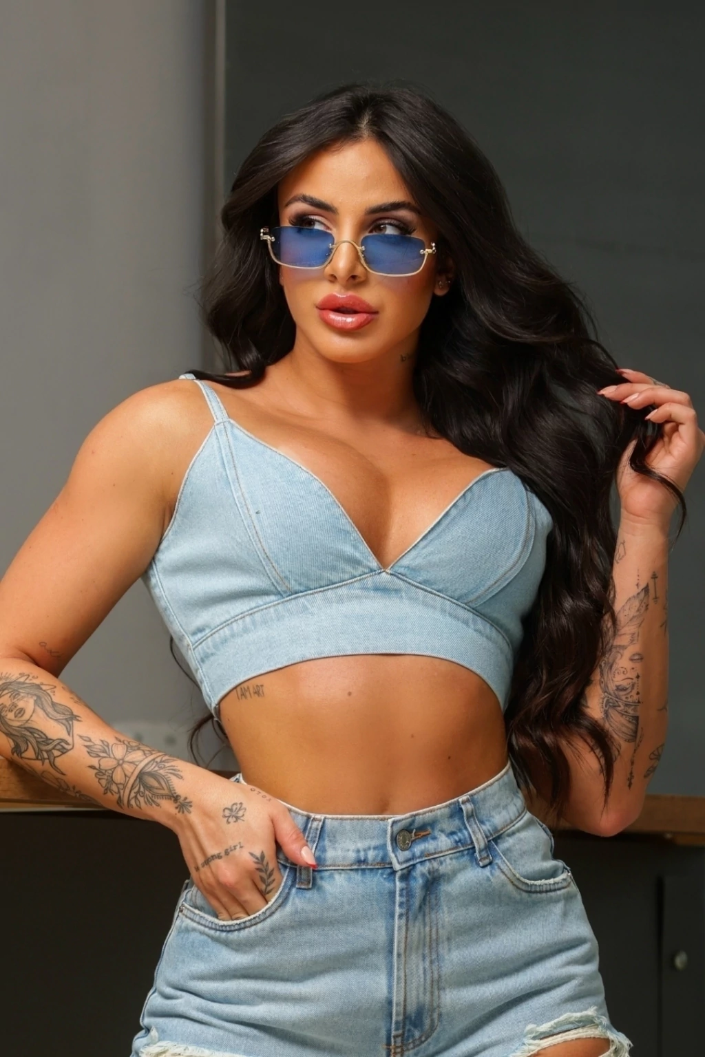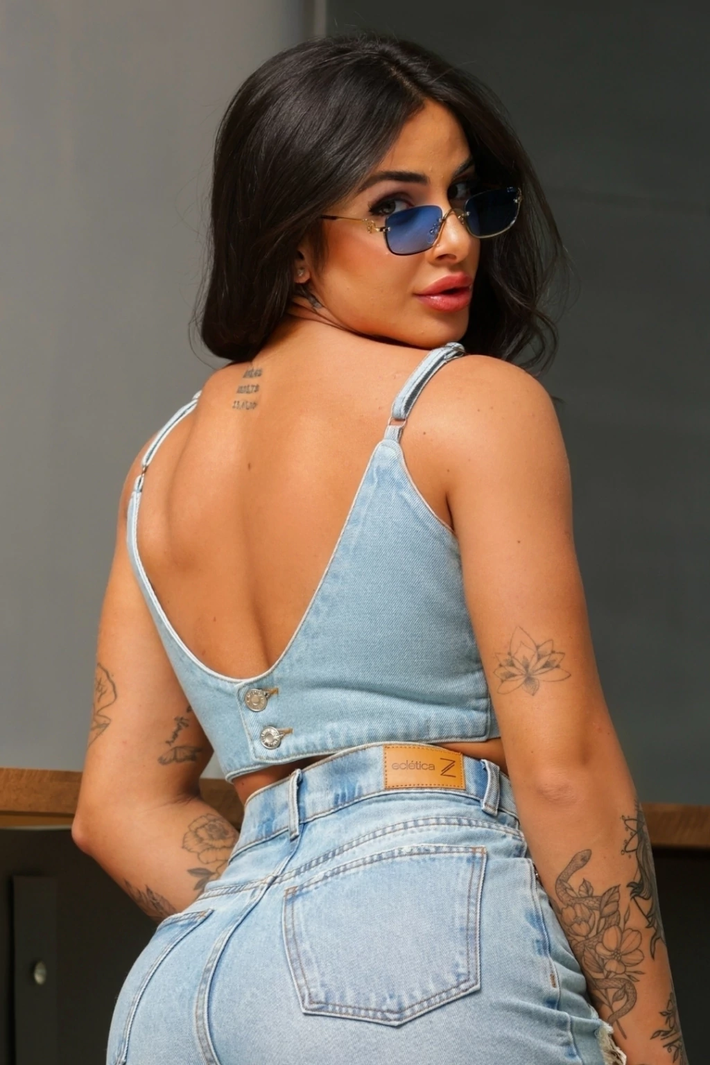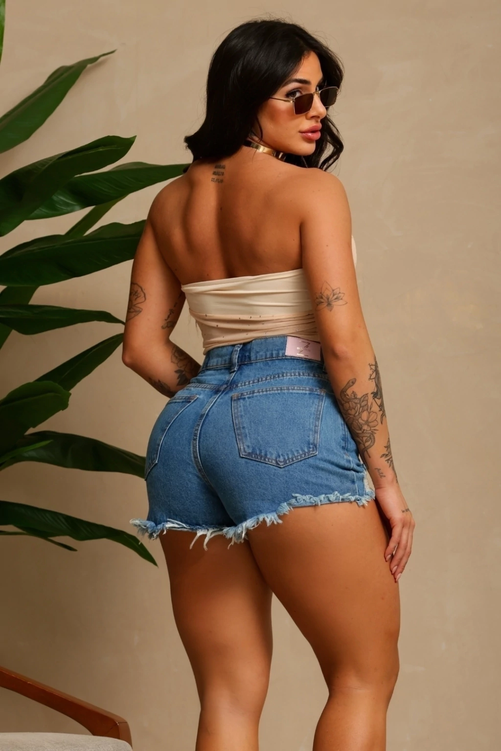 A peça é um short jeans, com cintura alta que valoriza a silhueta.