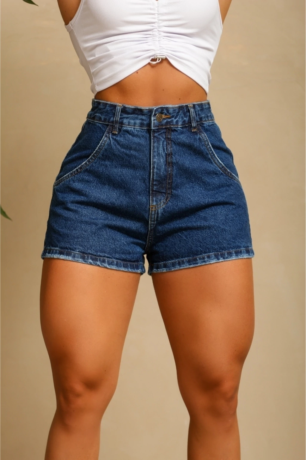 Modelagem: cintura alta, corte reto, comprimento médio, bolsos frontais e traseiros funcionais, proporcionando caimento confortável e versátil.